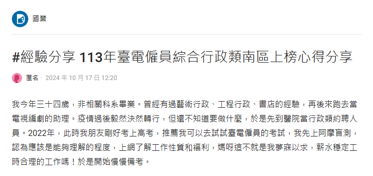 - 台灣電力公司(企管)鄭○婷